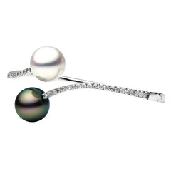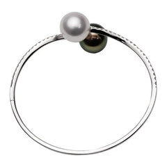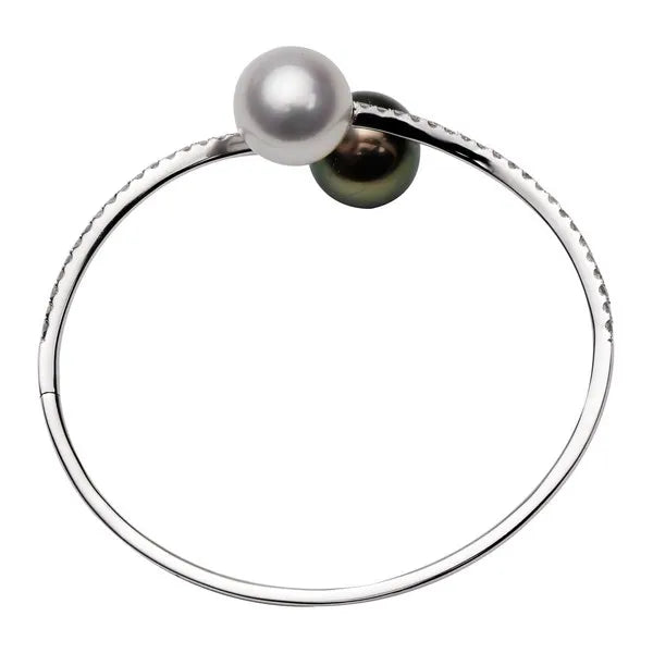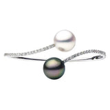 18K white gold bangle with 42 cascading diamonds, ending with offset White South Sea and Black Tahitian pearls.