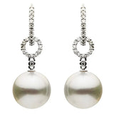 Luminous and sparkling, these pearl and diamond hoop earrings are a perfect for any occasion. Two round white pearls are suspended from petite, pavé diamond hoops with a hinged back closure crafted in polished 18k white gold.